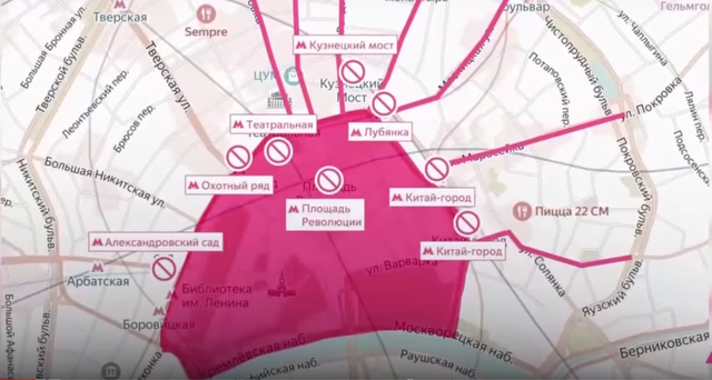 Красная зона на снимке - это площадь завтрашних ограничений. В эту зону нельзя будет заехать на транспорте, включая метро (7 станций будут закрыты на вход и на выход). Нельзя туда будет войти и пешком - все пешеходные пути тоже будут перекрыты. В этой красной зоне не будет работать большинство магазинов, рестораны и прочие заведения. Только некоторые продуктовые останутся в рабочем режиме. Это беспрецедентное перекрытие центра Москвы. Похожего даже не было перед парадом на День Победы.